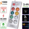 Πολύπριζο ασφαλείας με Πολλαπλή Προστασία Υπέρτασης 8 θέσεων, 1600 Joules, 55000 Amperes, 3 θύρες USB-A, 1 θύρα USB-C, διακόπτη επαναφοράς, και διπλό Έλεγχο με δύο φωτεινές Ενδείξεις για Προστασία και Γείωση.