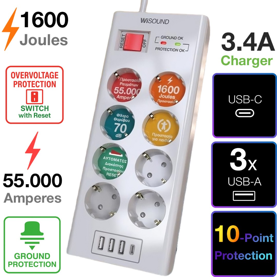 Surge Protector with 1600Joules, 8-sockets, 3 USB-A, 1 USB-C port, and Reset Switch