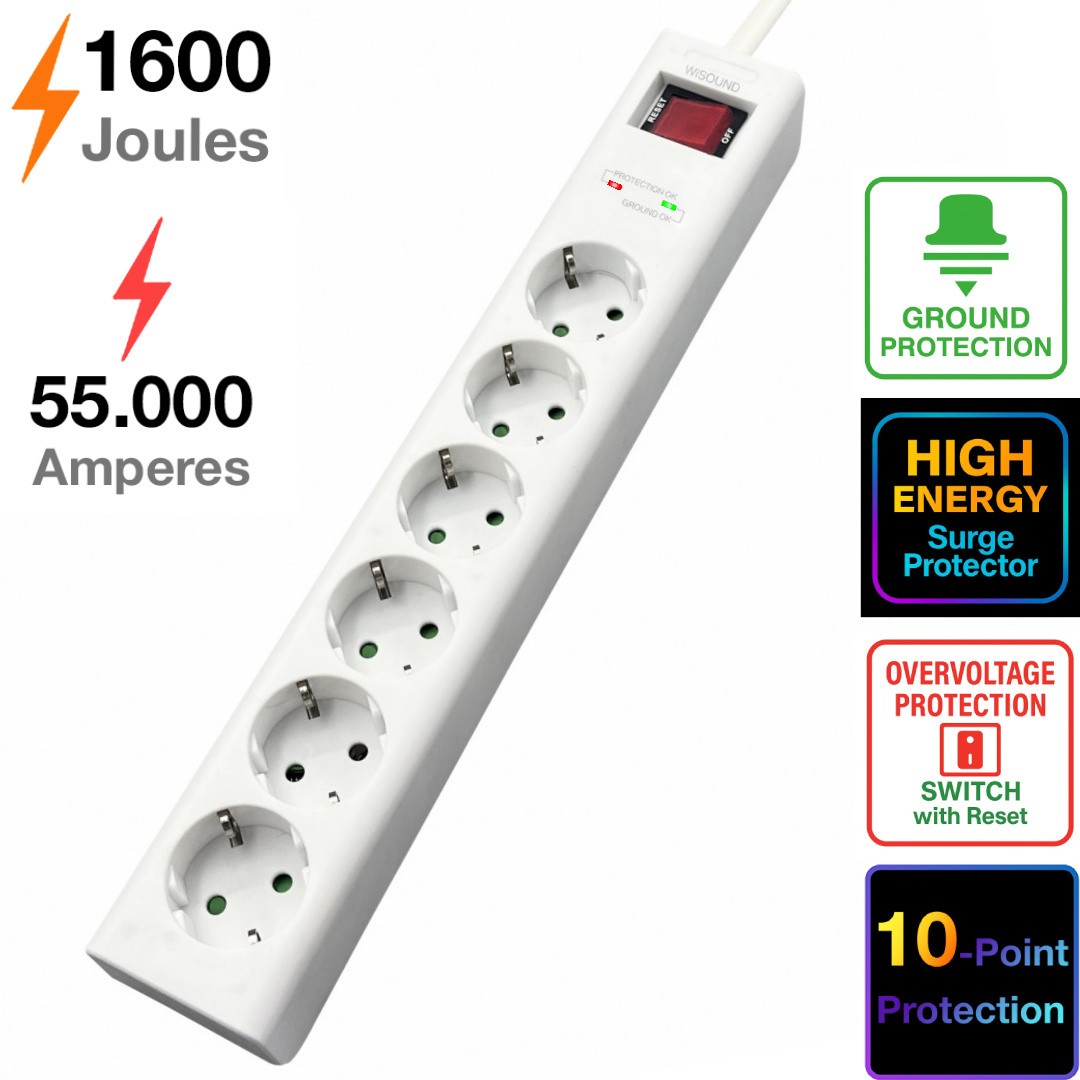 6-Outlet Surge Protector with Multi-Protection, 1600J / 55,000A, Reset Switch, and Dual LED Indicators (Surge & Ground).