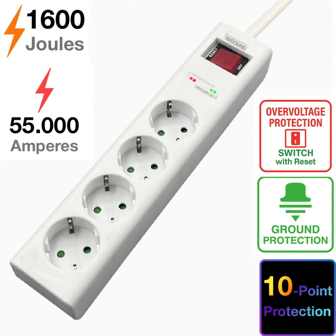 4-Outlet Surge Protector with Multi-Protection, 1600J / 55,000A, Reset Switch, and Dual LED Indicators (Surge & Ground).